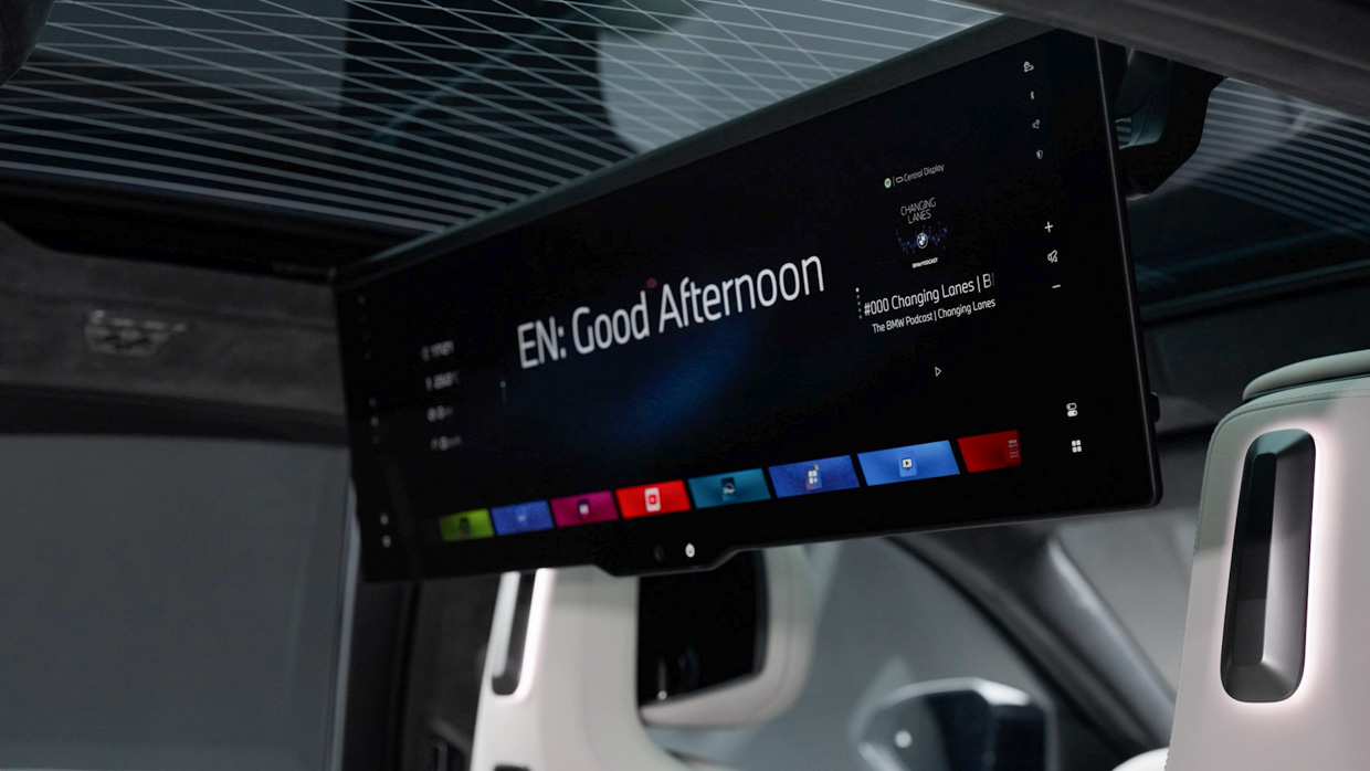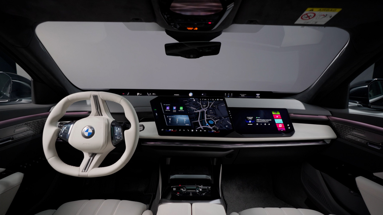 Panoramic iDrive remplace le combiné d’instruments traditionnel par une projection pleine largeur sur la partie inférieure du pare-brise, complétée par un écran central de 17,9 pouces et un affichage tête haute 3D à l’usage du conducteur.