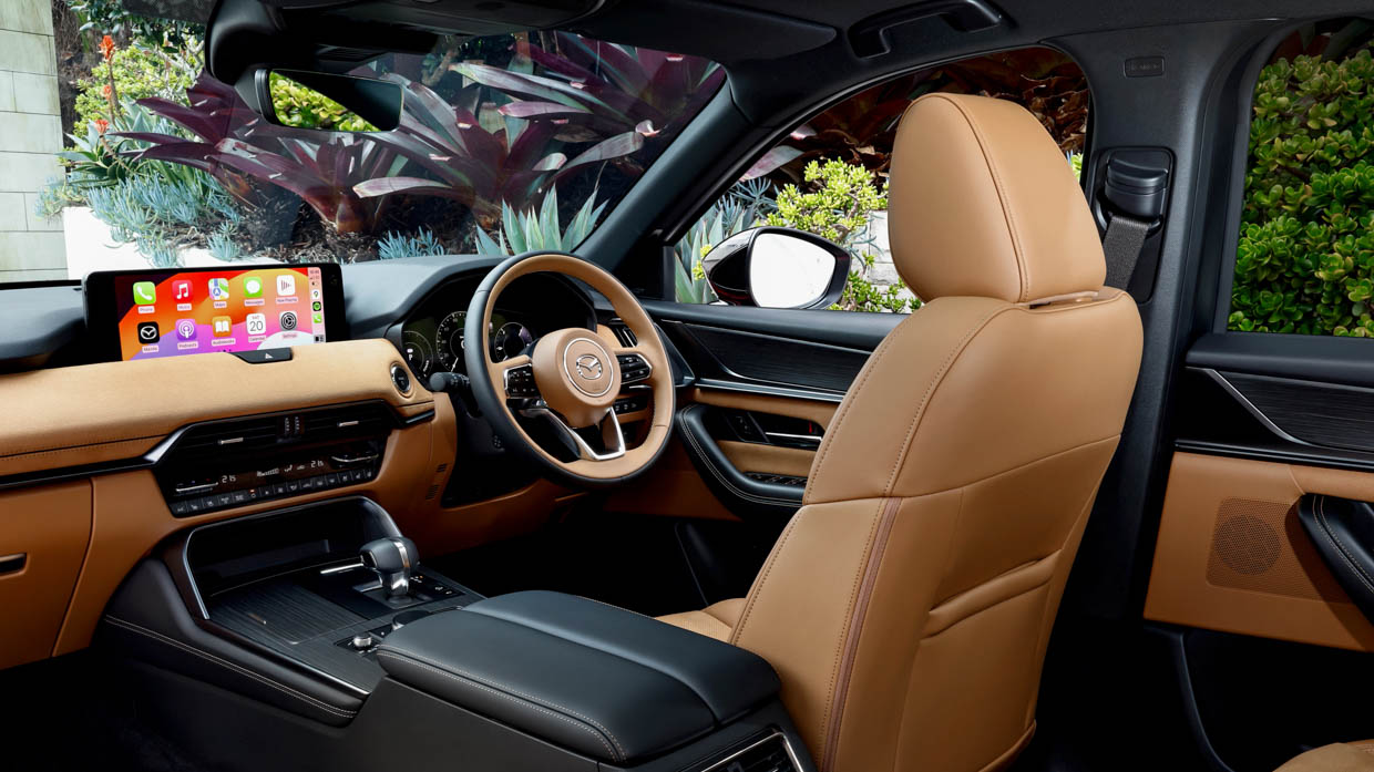 7 000 $ supplémentaires achètent la GT, et c'est ici que le CX-80 commence vraiment à avoir fière allure. Il roule sur des alliages noirs de 20 pouces et possède des passages de roue et un revêtement inférieur de la couleur de la carrosserie. C'est un SUV au look saisissant comme celui-ci, en particulier dans la nouvelle peinture métallisée Melting Copper, bien que l'éternel favori Soul Red Crystal ressemble également à l'entreprise.