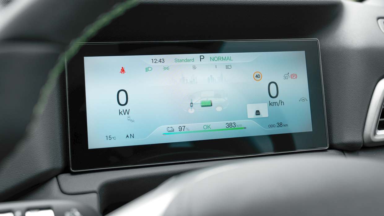 Des boutons physiques sont utilisés sur le volant à rebord fin et pour les commandes de volume, de mode de conduite et de freinage régénératif – et bien que les commandes de climatisation soient numériques, elles apparaissent dans une barre de raccourci toujours visible en bas de l’écran tactile principal.