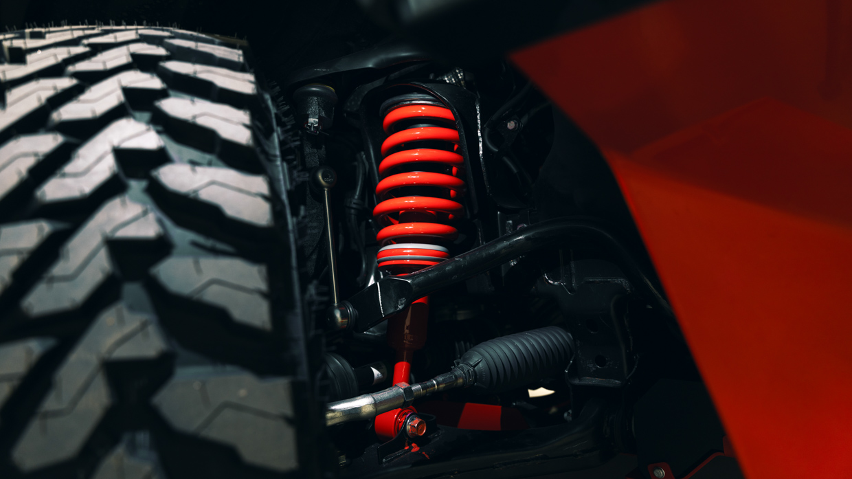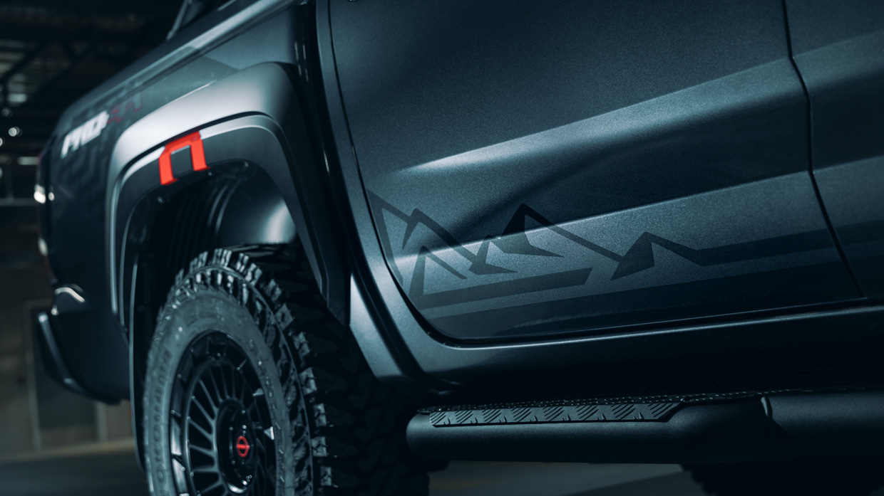 Le Concept ajoute une hauteur de caisse surélevée avec un réglage de suspension spécifique, comprenant des ressorts hélicoïdaux et des amortisseurs avant finis en rouge lave, ainsi qu’une voie plus large offerte par l’installation de roues de 17 pouces à déport modifié. Le caoutchouc de choix est d’énormes pneus tout-terrain de 32,2 pouces.
