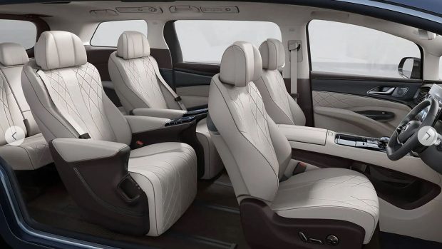 Le sept places présente une configuration 2+2+3 avec deux sièges capitaine dans la rangée centrale – avec chauffage, ventilation, fonction de massage et repose-jambes électriques ; le tout contrôlé via des écrans de 5,5 pouces intégrés aux accoudoirs.