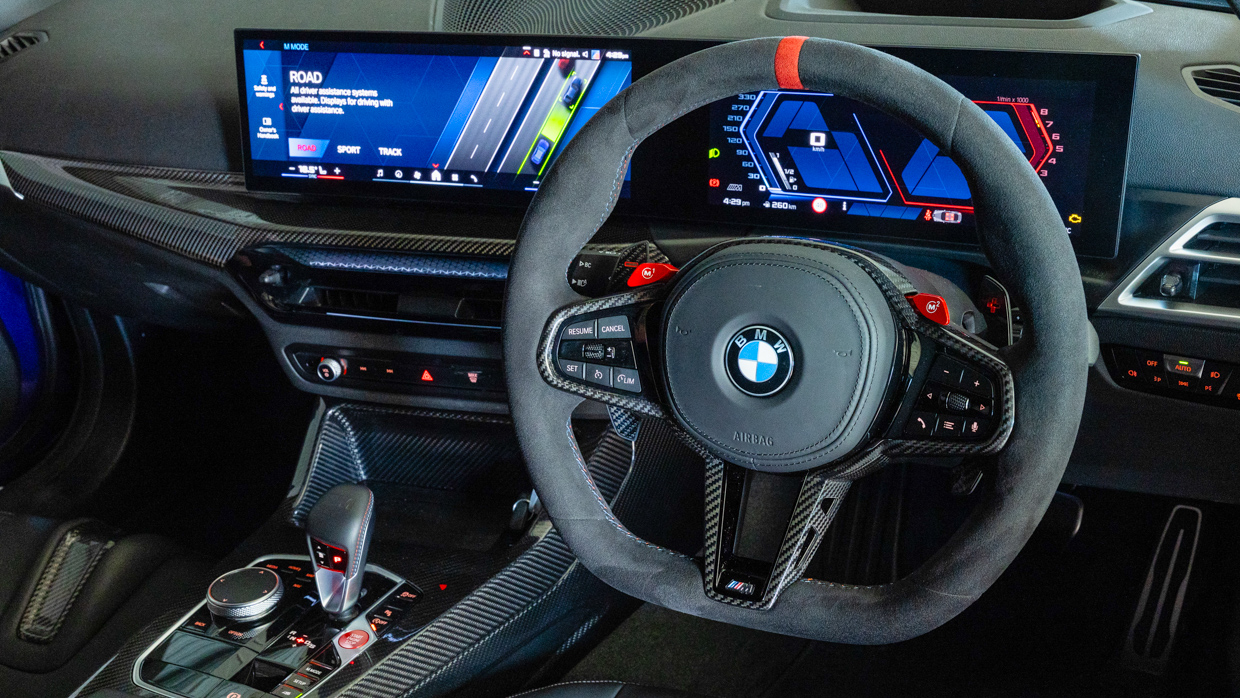 Si vous êtes suffisamment mince et souple pour manœuvrer dans ses sièges baquets M Carbon, il y a beaucoup à apprécier dans son volant en Alcantara et sa facilité de conduite générale, ainsi que dans ses panneaux de porte CS éclairés (et ses plaques de seuil à lettres rouges).