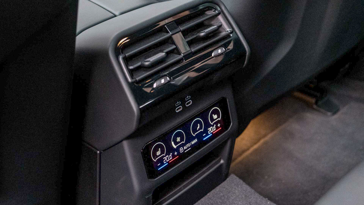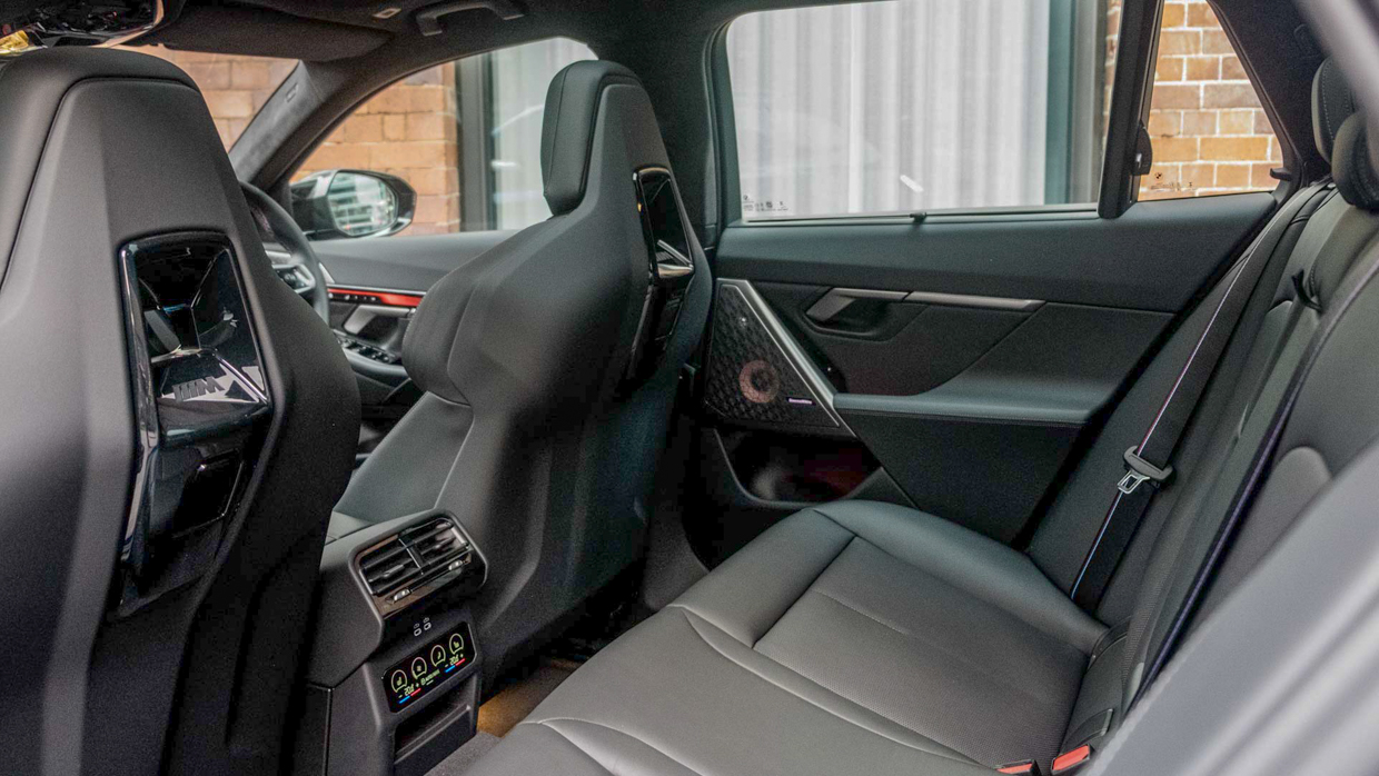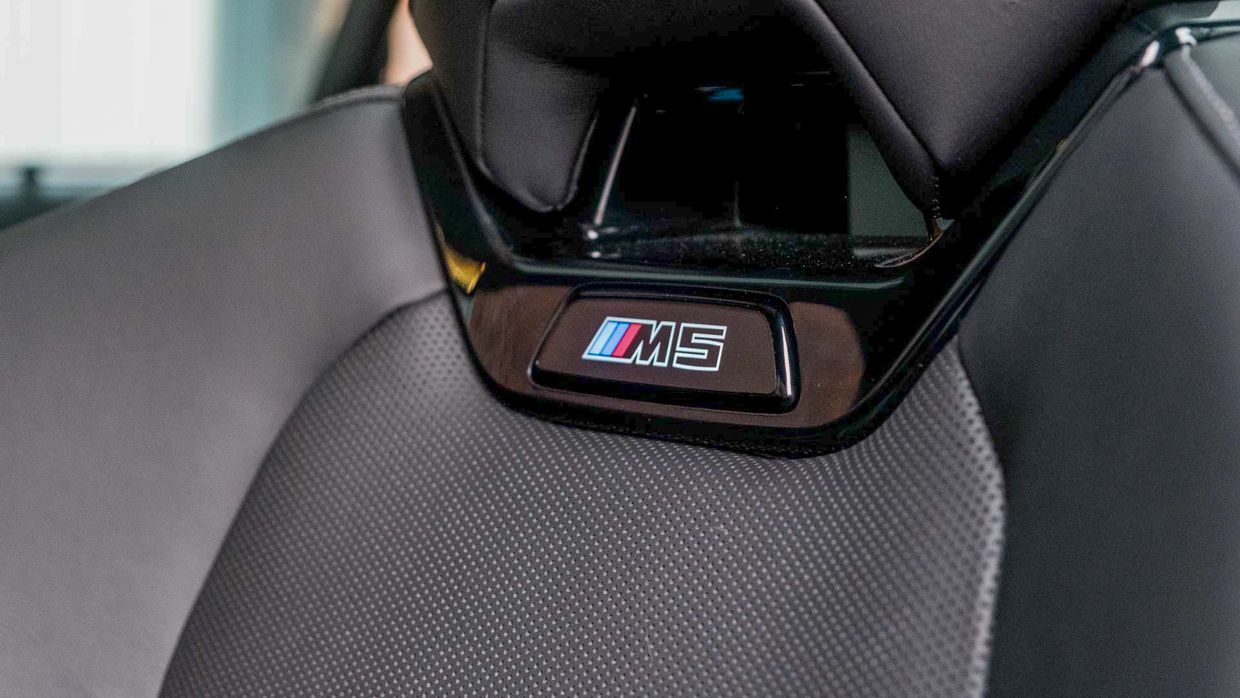 La banquette arrière ne rivalise pas avec un SUV en termes d’espace, mais vous pourrez facilement accueillir deux adultes à l’arrière avec un grand toit en verre laissant entrer la lumière et un espace remarquablement bon pour les pieds, étant donné que le M5 doit contenir une batterie.