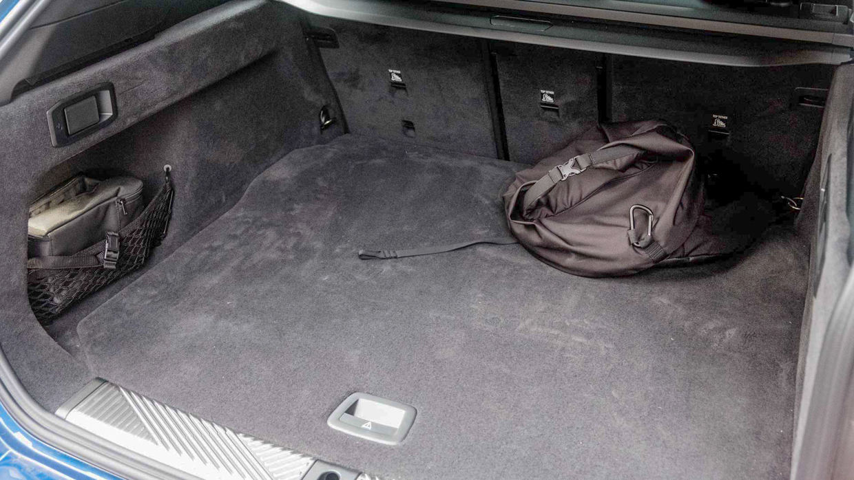 Dans la berline M5, le coffre est compromis par l’emballage de la batterie, ce qui est beaucoup moins important dans la Touring. Il s’agit d’un espace très long avec une légère pente ascendante et une largeur étroite au milieu. Ainsi, bien qu’il semble énorme, la cote officielle est de 500 L, identique à celle du plus petit M3 Touring.