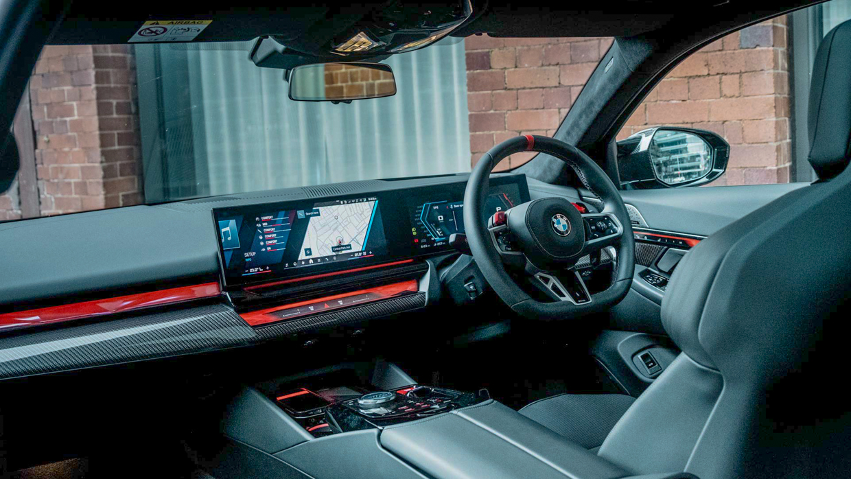 Même si elle ne domine pas les débats, la technologie de l’habitacle du M5 joue un rôle de soutien important. Les écrans nets et lumineux sont intégrés en une seule unité et orientés vers le conducteur.