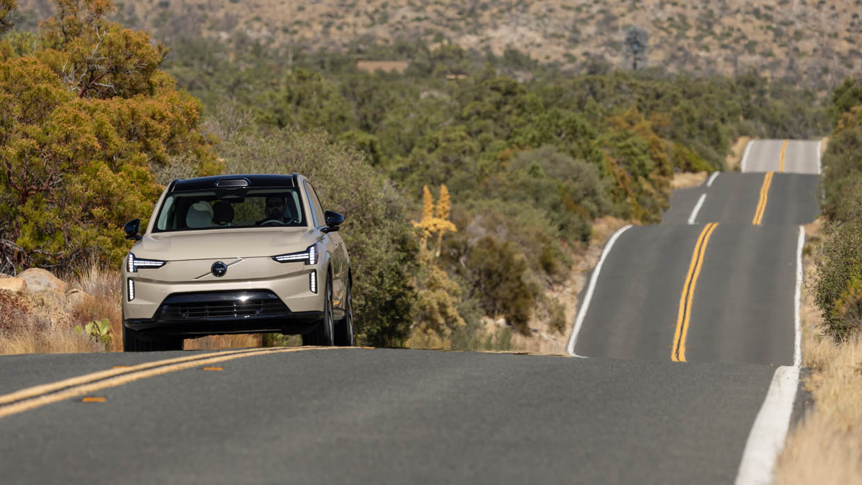 Durant cette période, nous avons constaté que les systèmes de sécurité complets de l'EX90 fonctionnaient avec une subtilité et une sûreté impressionnantes, en particulier son assistance au maintien de voie et son régulateur de vitesse adaptatif bien calibré lorsque l'on roulait à 130 km/h sur les autoroutes vallonnées du sud de la Californie.