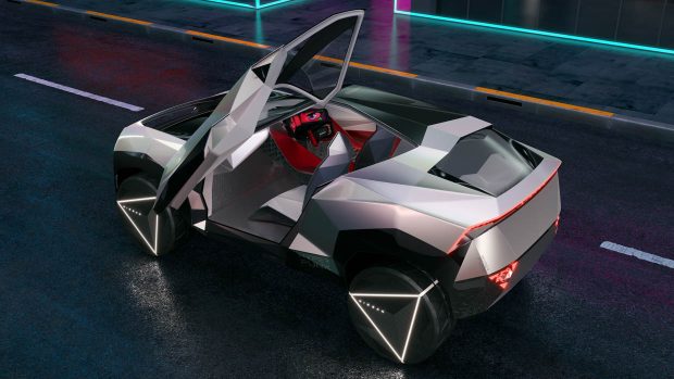 Nissan note l’utilisation d’« éléments de style origami » sur le design extérieur qui présente des surfaces « polygonales » sur toute la carrosserie et sur les énormes roues de 23 pouces.