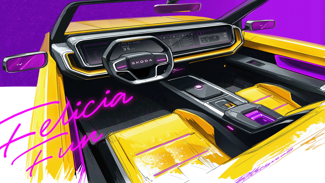 À l'intérieur, Felicia Fun arbore un écran multimédia pleine largeur, avec des graphiques rappelant les graphiques de jeux vidéo rétro, du moins dans l'esquisse fournie. L'énorme écran se trouve devant des sièges de seau jaune vif ornant des ascensions roses néon, qui sont séparées par une grosse console centrale.