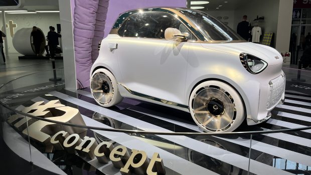 Une petite citadine à deux portes aux accents blancs et dorés – la Smart #2 Concept – a laissé tomber les mâchoires à côté d’une surcharge de véhicules électriques de la taille d’un yacht exposés.
