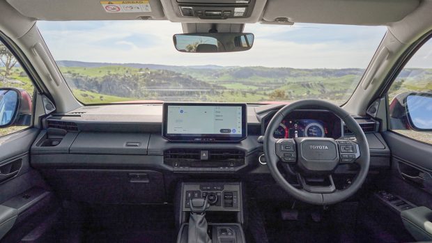 À côté de toutes les variantes se trouve un écran tactile de 12,3 pouces chargé du multimédia, installé au-dessus d’une série de boutons physiques avec des cadrans tordus à l’ancienne pour la climatisation à zone unique installée sur le Workmate, tandis que les versions supérieures comportent de gros commutateurs et cadrans avec une conception globale du tableau de bord et un levier de vitesses rappelant le Prado de la série 250.