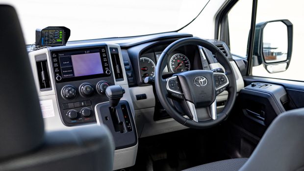 Le prototype – qui devrait lancer un programme pilote client localement ce mois-ci dans le cadre de la prochaine étape de son développement – ressemble à un Hiace ordinaire à l’intérieur comme à l’extérieur.