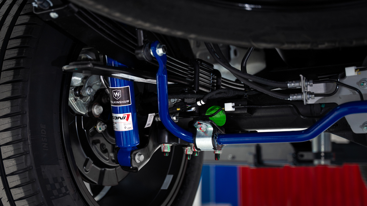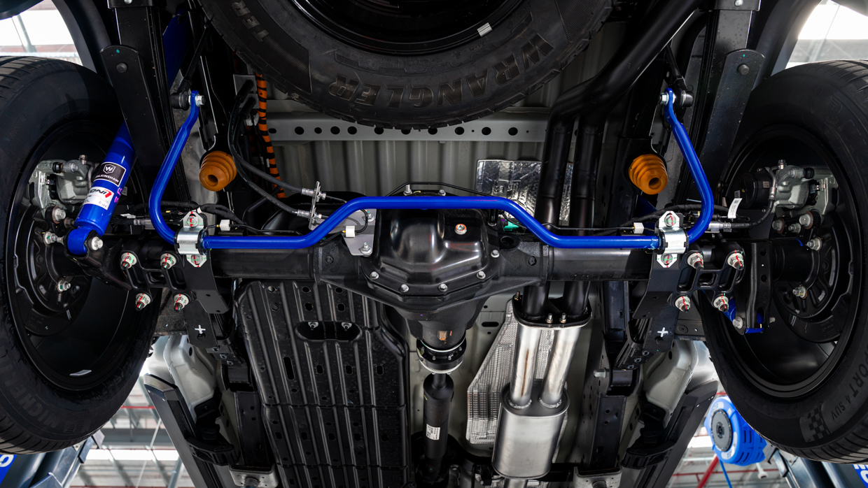 Les bobines avant et les ressorts à lames arrière semblent être hérités du Style, mais il existe une nouvelle barre anti-roulis arrière personnalisée de 22 mm (peinte du même bleu que les amortisseurs) qui est boulonnée directement au châssis via de nouveaux points de montage en métal forgé, tandis que la barre anti-roulis avant de l’Amarok a été supprimée.