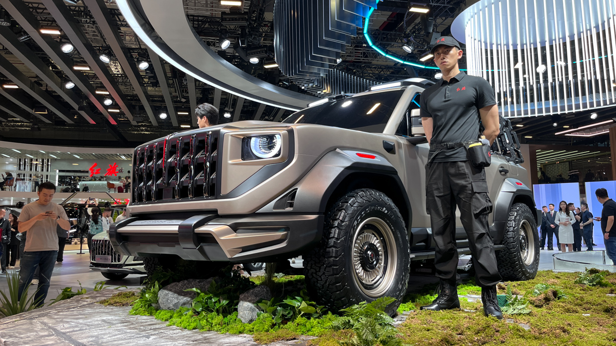 Le concept de Hongqi Auto SUV tout-terrain, avec une garde militaire chinoise à l'air solide, a un style inspiré par Travail traditionnel chinois en architecture. Il ressemble toujours à un défenseur Land Rover du côté et à un G-Wagen de l'avant. Apparemment, il utilise un Système de moteur quadricléatteint 100 km / h en quatre secondes et fonctionnalités Trois verrous Diff.